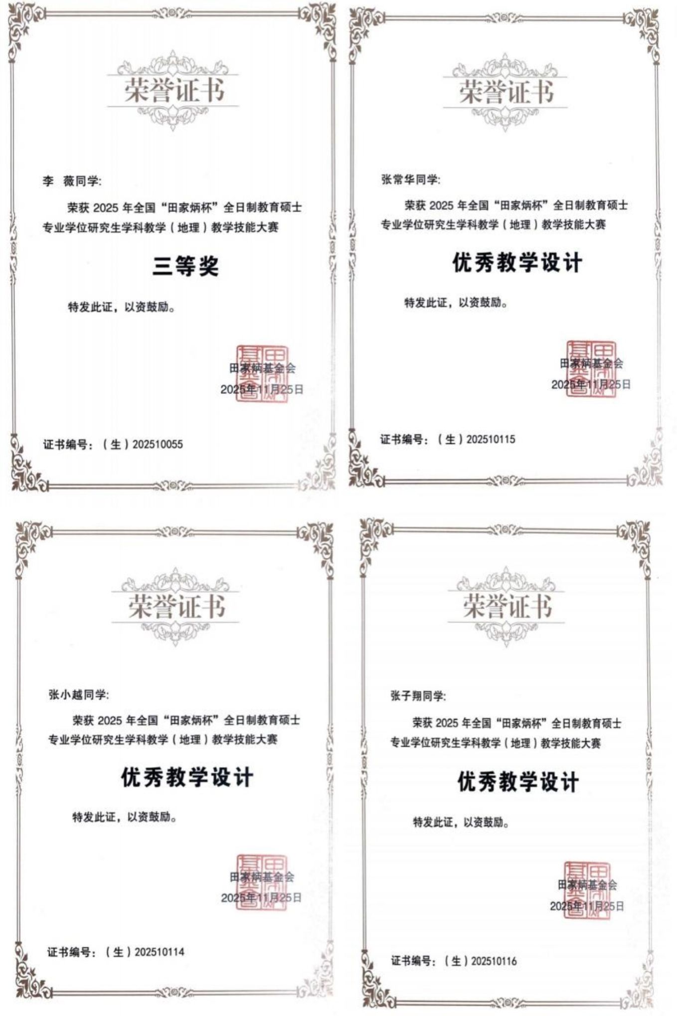 我院 4 名选手在决赛中沉着应战最终收获三等奖 1 项、优秀教学设计奖 3 项。这既展现了我院学科教学(地理)专业教育硕士的专业基础与教学潜力,也是我院始终坚持 “以赛促教、以赛促学、以赛促改”理念的集中体现。未来,我院将针对教学创新设计、临场应变能力、赛事技巧等核心维度持续发力,帮助学生进一步夯实专业知识储备、优化教学设计逻辑、提升现场授课感染力与答辩精准度,通过不断总结经验、查漏补缺,为学生成长为优秀中学地理教师筑牢根基。期待全院师生以此为契机,进一步深化教学改革、强化实践教学,在未来各项赛事中再创佳绩,为学校赢得更多荣誉!