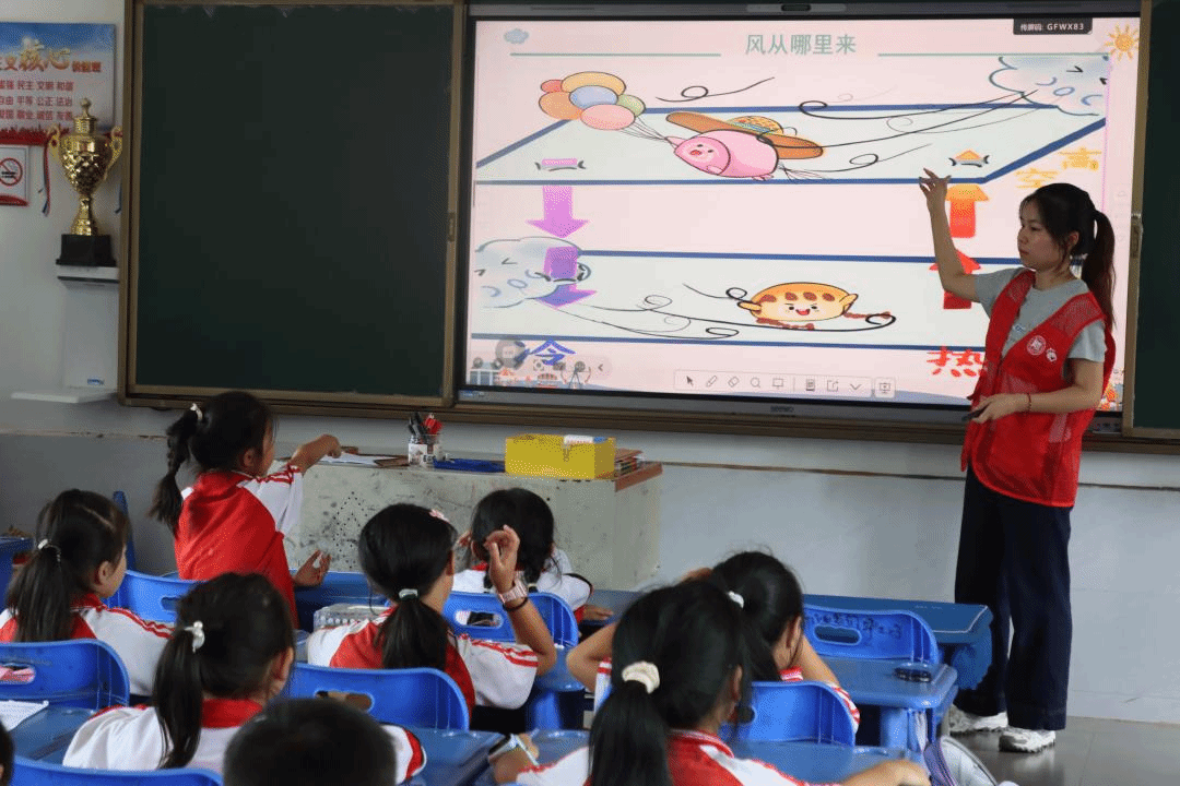 活动中,支教团成员们通过轻松有趣的互动方式,引导小朋友们逐步探索风的奥秘。他们用生活中常见的现象和趣味小实验,生动地演示了风的形成过程。小朋友们在欢声笑语中积极参与,不仅了解了风的产生原理,还对风的方向和强度有了直观的认识。这种寓教于乐的方式,让复杂的科学原理变得简单易懂,激发了小朋友们对自然现象的好奇心和探索欲。