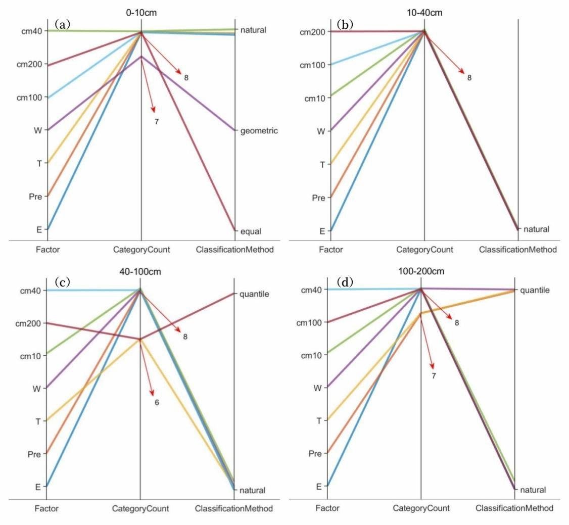 Figure 10. The figure displays the optimal classification methods and break numbers of influencing factors for different soil layers.
