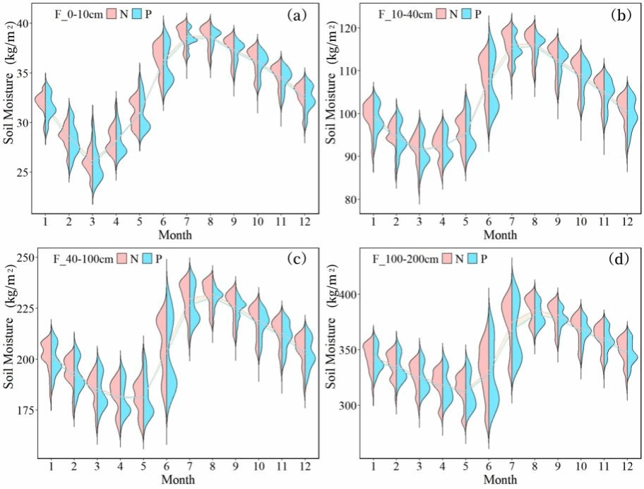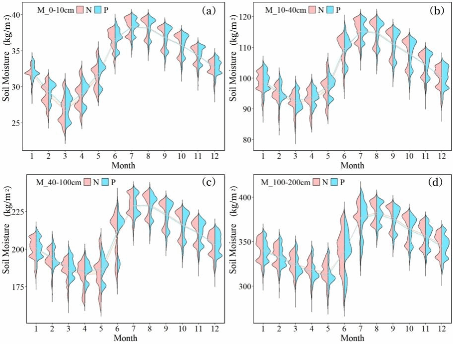 Figure 5. N represents natural forests, P represents planted forests, and the yellow ribbon indicates the difference in mean soil moisture content between natural forests and planted forests in medium-textured soils.