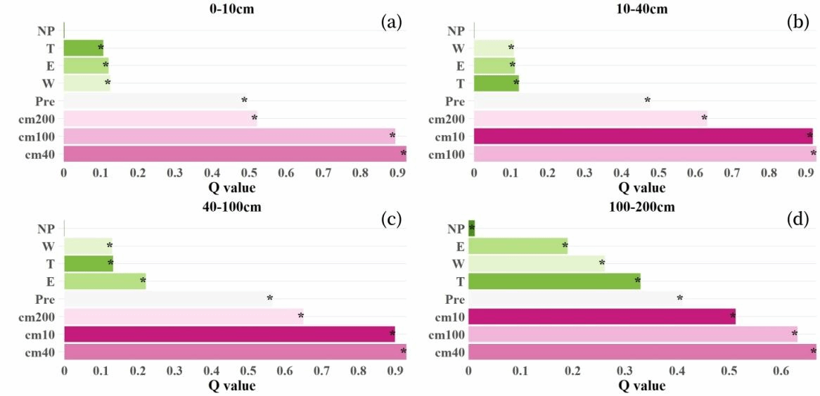 成果简介:土壤水分是影响陆地生态系统和植物生长发育的重要因素,本研究利用气象、土壤水分、土壤质地及人工林与自然林空间分布数据,探究不同质地与深度土壤人工林与自然林土壤水分的空间分布特征,并构建地理探测器模型剖析土壤水分的驱动机制。结果表明:(1)人工林对土壤水分的消耗大于自然林,其中差异明显程度:粗纹理类型土壤>中等纹理类型土壤>精细纹理土壤。(2)各土壤层水分含量空间分异主要由10-40cm土壤层决定,0-10cm层土壤水分含量受风速影响较大。(3)流域内主要人工林种类为桉树、杉树,其主根扎根深度为100-200cm,该土壤层林种类别会导致土壤水分空间分异。本研究揭示了人工林种植对土壤水分的消耗巨大且会影响土壤水分的空间分异,为该地区的生态恢复工程管理提供理论指导。