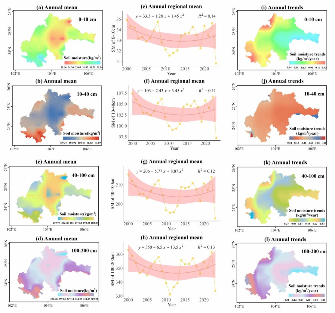 Figure 3. (a−d) The annual mean soil moisture content across different soil layers; (e−h) the interannual temporal trends of soil moisture content for each soil layer from 2000 to 2023; while (i−l) the spatial variation trends of annual-scale soil moisture content across different soil layers during 2000−2023.