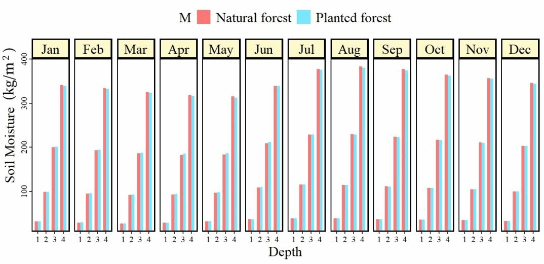 Figure 8. The vertical distribution of soil moisture content in medium-textured soils is shown, with pink representing natural forests and blue representing planted forests.