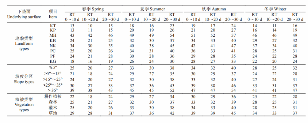 表1 不同下垫面(地貌、坡度、植被类型)的骤旱平均恢复概率 (%)