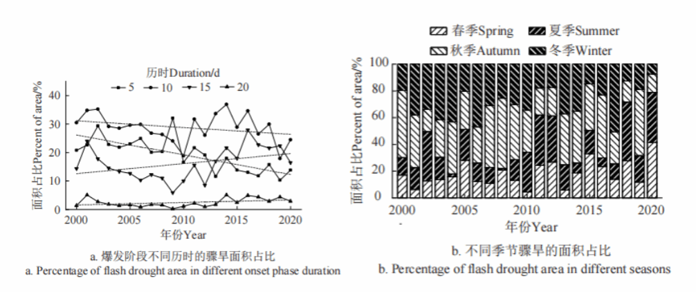 图3 爆发阶段不同历时的骤旱事件面积占比和发生季节面积占比的变化趋势。