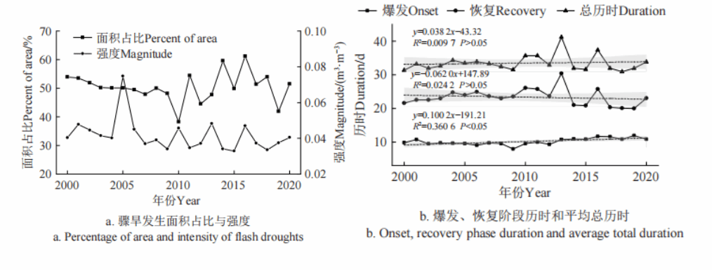 图2 2000-2020年骤旱发生面积占比、强度、爆发、恢复阶段历时和平均总历时的变化趋势